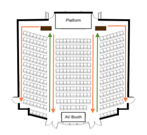 - If you’re seated in a side row, you will walk up a center aisle (see green arrows on the floorplan below), and return to your seats by the side aisle.